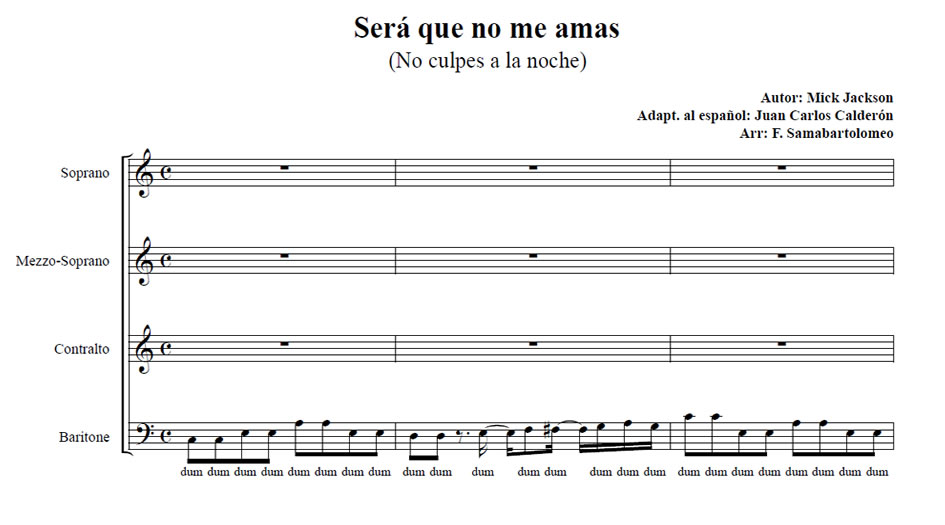 Será que no me amas Anterior Siguiente Favorito Categorías de Archivo: Partituras SATBEtiquetas de Archivo: SATB DescripciónArchivoMidi(No culpes a la noche) del tema original: «Blame It In On The Boogie» (1978) Autor: Mick Jackson Adapt. al español: Juan Carlos Calderón Arreglo Coral: F. Samabartolomeo -----------------EmailWhatsAppFacebook 270 Sera_que_no_me_amas.pdf Sera_que_no_me_amas.mid