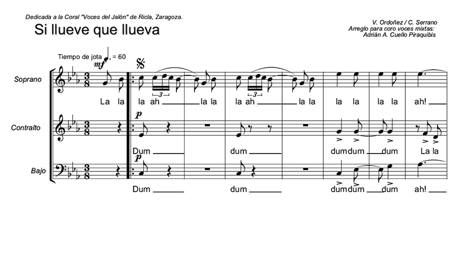 Si llueve que llueva Anterior Siguiente Favorito Categorías de Archivo: Partituras SABEtiquetas de Archivo: Navidad SAB DescripciónArchivoRetribuir al ArregladorJota Villancico Letra y Música: C. Serrano & V. Ordóñez Arreglo Coral: Adrián A. Cuello Piraquibis -----------------EmailWhatsAppFacebook 233 Si_llueve_que_llueva.pdf"¿Te gusta y te es útil mi arreglo? Cualquier aporte que puedas hacer seguirá alentando mi labor como arreglador. Muchas Gracias!"