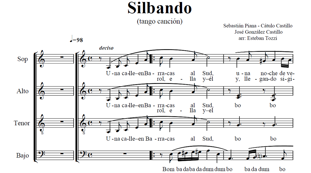 Silbando Anterior Siguiente Favorito Categorías de Archivo: Partituras SATBEtiquetas de Archivo: SATB DescripciónArchivoMidiVideo ReferenciaRetribuir al ArregladorTango canción Letra y Música: Sebastián Piana, Cátulo Castillo y José González Castillo Arreglo Coral: Esteban Tozzi Para SATB y Solista -----------------EmailWhatsAppFacebook 232 Silbando.pdf Silbando.midVideo Referencia"¿Te gusta y te es útil mi arreglo? Cualquier aporte que puedas hacer seguirá alentando mi labor como arreglador. Muchas Gracias!"