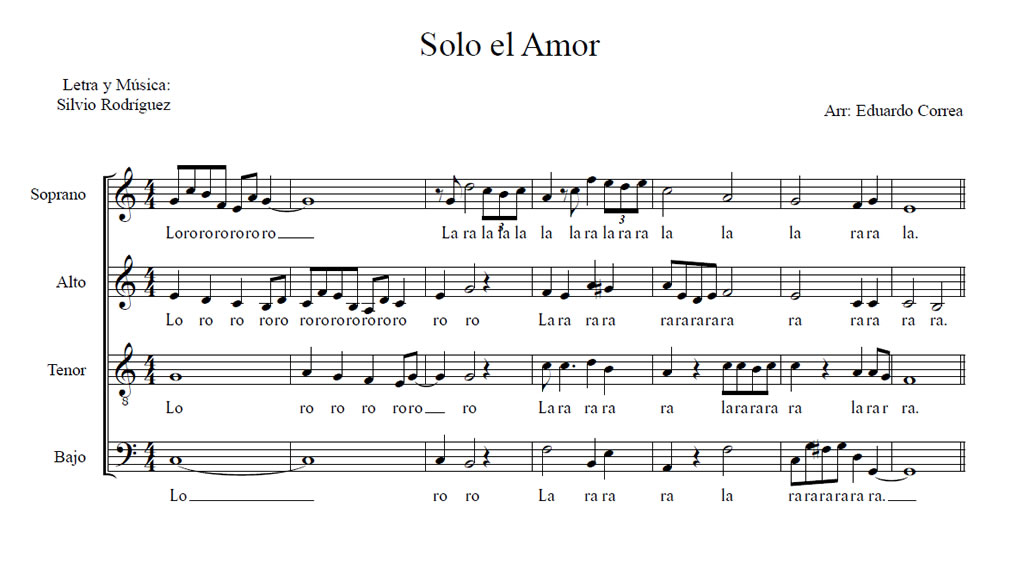 Solo el Amor Anterior Siguiente Favorito Categorías de Archivo: Partituras SATBEtiquetas de Archivo: SATB DescripciónArchivoMidiLetra y Música: Silvio Rodríguez Arreglo Coral: Eduardo «Chino» Correa -----------------EmailWhatsAppFacebook 213 Solo_el_Amor_SATB.pdf Solo-el-Amor-.-Coro.mid