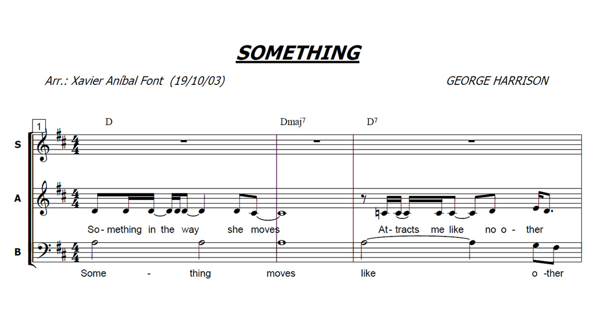 Something Anterior Siguiente Favorito Categorías de Archivo: Partituras SABEtiquetas de Archivo: SAB DescripciónArchivoRetribuir al ArregladorLetra y Música: George Harrison Arreglo Coral: Xavier Aníbal Font (19/10/2003) -----------------EmailWhatsAppFacebook 312 Something-.pdf"¿Te gusta y te es útil mi arreglo? Cualquier aporte que puedas hacer seguirá alentando mi labor como arreglador. Muchas Gracias!"