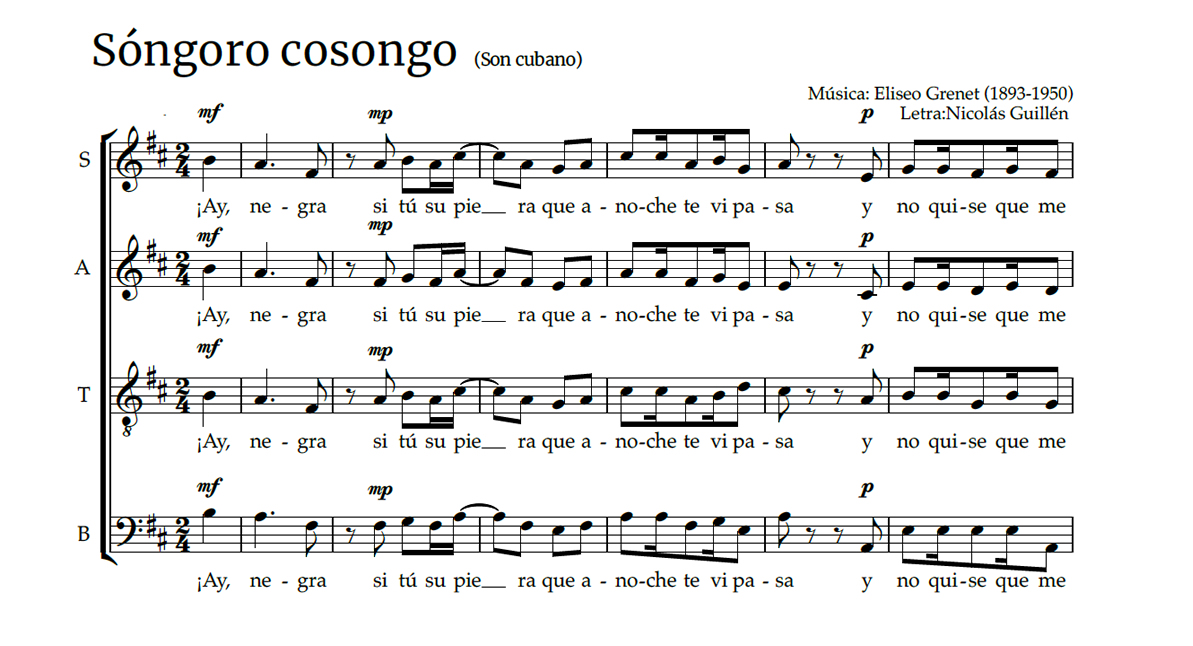 Sóngoro cosongo Anterior Siguiente Favorito Categorías de Archivo: Partituras SATBEtiquetas de Archivo: SATB DescripciónArchivoVideo ReferenciaAudio de Estudio(Son cubano) Música: Eliseo Grenet (1893-1950) Letra: Nicolás Guillén -----------------EmailWhatsAppFacebook 304 Songoro_cosongo.pdfVideo ReferenciaAudio de Estudio