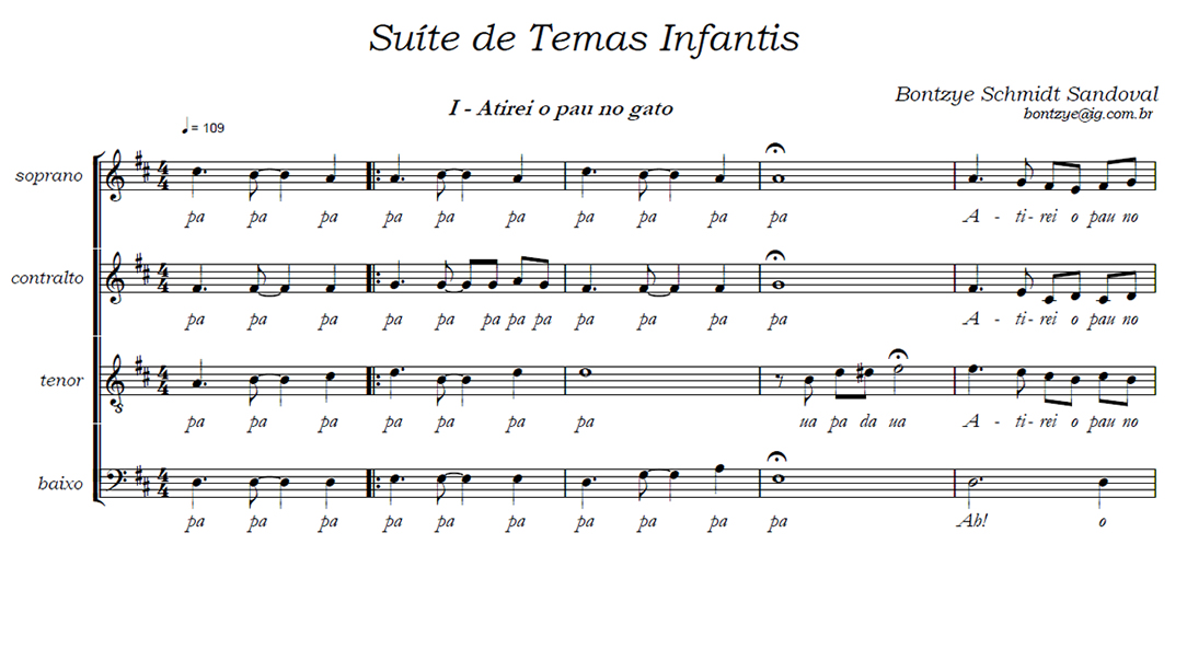 Suíte de Temas Infantis Anterior Siguiente Favorito Categorías de Archivo: Partituras SATBEtiquetas de Archivo: SATB DescripciónArchivoMidiSuíte de Temas Infantis Arreglo Coral: Bontzye Schmidt Sandoval Contiene: I – Atirei o pau no gato II – Nesta rua III – Terezinha de Jesus IV – O Cravo brigou com a Rosa V – Samba Lelê -----------------EmailWhatsAppFacebook 164 Suite_de_Temas_Infantis.pdf Suite_de_Temas_Infantis.mid