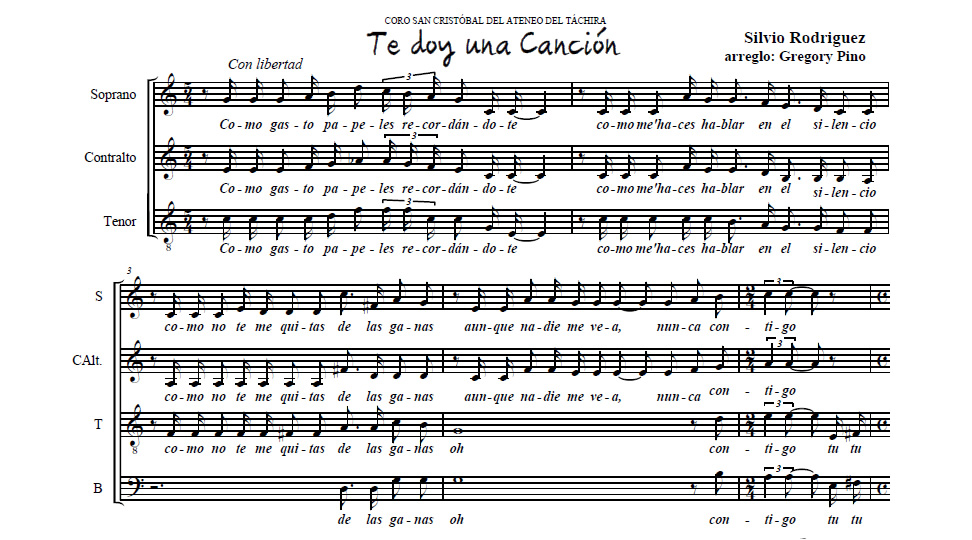 Te doy una canción Anterior Siguiente Favorito Categorías de Archivo: Partituras SATBEtiquetas de Archivo: SATB DescripciónArchivoRetribuir al ArregladorSilvio Rodriguez Arreglo Coral: Gregory Pino Hola, te gusta mi trabajo? puedes ayudarme haciendo una donación a mi cuenta paypal: gregorypino@yahoo.com -----------------EmailWhatsAppFacebook 313 Te-doy-una-Cancion.pdf"¿Te gusta y te es útil mi arreglo? Cualquier aporte que puedas hacer seguirá alentando mi labor como arreglador. Muchas Gracias!"