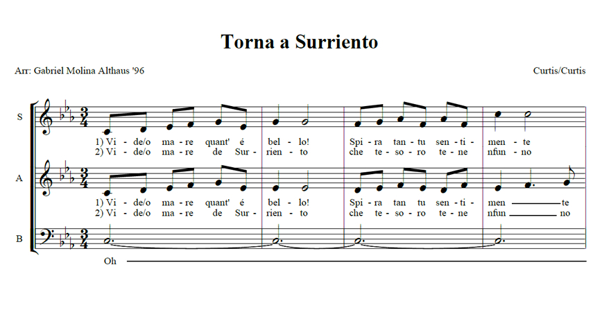 Torna a Surriento Anterior Siguiente Favorito Categorías de Archivo: Partituras SABEtiquetas de Archivo: SAB DescripciónArchivoVideo ReferenciaCanción napolitana Letra: Giambattista De Curtis Música: Ernesto de Curtis Arreglo Coral: Gabriel Molina Althaus -----------------EmailWhatsAppFacebook 450 Torna-a-Surriento.pdfVideo Referencia