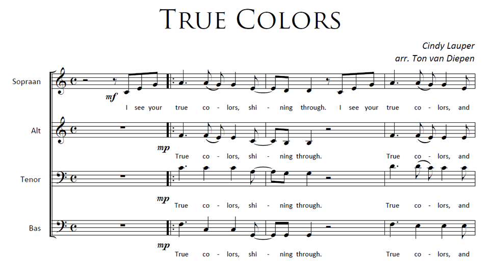 True Colors Anterior Siguiente Favorito Categorías de Archivo: Partituras SATBEtiquetas de Archivo: SATB DescripciónArchivoVideo ReferenciaLetra y Música: Cindy Lauper Arreglo Coral: Ton van Diepen Con divisi -----------------EmailWhatsAppFacebook 278 True_Colors.pdfVideo Referencia