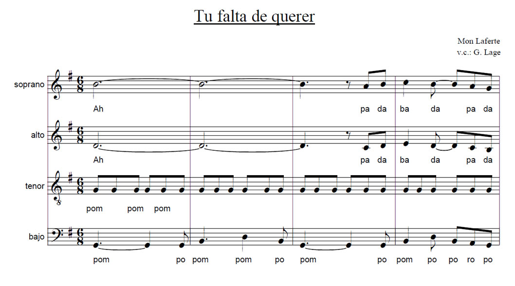 Tu falta de querer Anterior Siguiente Favorito Categorías de Archivo: Partituras SATBEtiquetas de Archivo: SATB DescripciónArchivoLetra y Música: Mon Laferte Arreglo Coral: Gabriel Lage -----------------EmailWhatsAppFacebook 180 Tu_falta_de_querer_SATB.pdf