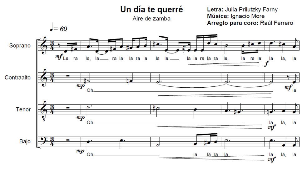 Un día te querré Anterior Siguiente Favorito Categorías de Archivo: Partituras SATBEtiquetas de Archivo: SATB DescripciónArchivoRetribuir al ArregladorAire de zamba Letra: Julia Prilutzky Farny Música: Ignacio More Arreglo Coral: Raúl Ferrero -----------------EmailWhatsAppFacebook 93 Undiatequerre.pdf"¿Te gusta y te es útil mi arreglo? Cualquier aporte que puedas hacer seguirá alentando mi labor como arreglador. Muchas Gracias!"