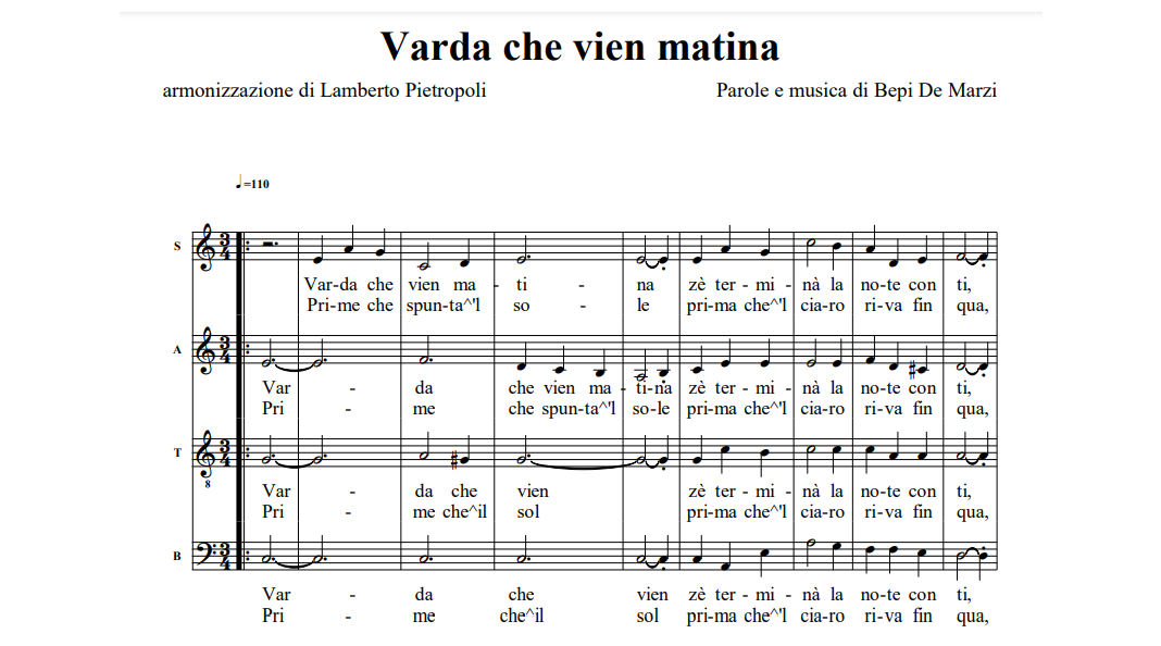 Varda che vien matina Anterior Siguiente Favorito Categorías de Archivo: Partituras SATBEtiquetas de Archivo: SATB DescripciónArchivoAudio de EstudioLetra y Música: Bepi De Marzi Arreglo Coral: Lamberto Pietropoli -----------------EmailWhatsAppFacebook 167 Varda-che-vien-matina.pdfAudio de Estudio