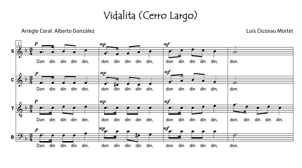 Vidalita (Cerro Largo) Anterior Siguiente Favorito Categorías de Archivo: Partituras SATBEtiquetas de Archivo: SATB DescripciónArchivoMidiLetra y Música: Luis Cluzeau Mortet (Montevideo, 1888-1957) Arreglo Coral: Alberto González -----------------EmailWhatsAppFacebook 69 Vidalita_Cerro_Largo_SATB.pdf Vidalita_Cerro_Largo_SATB.mid