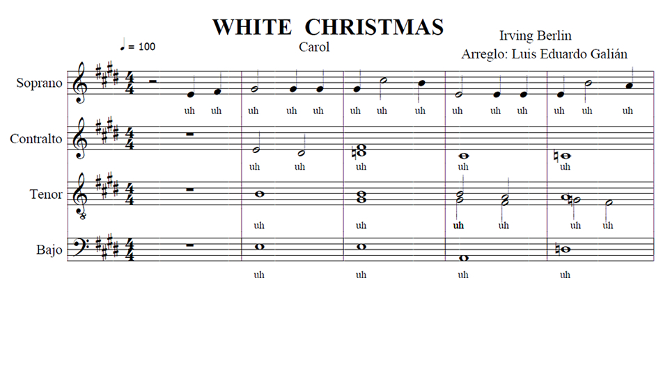 White Chistmas Anterior Siguiente Favorito Categorías de Archivo: Partituras SATBEtiquetas de Archivo: Navidad SATB DescripciónArchivoMidiRetribuir al ArregladorVillancico Letra y Música: Irving Berlin Arreglo Coral: Luis Eduardo Galián (Venezolano) -----------------EmailWhatsAppFacebook 166 White-Christmas.pdf White-Christmas.mid"¿Te gusta y te es útil mi arreglo? Cualquier aporte que puedas hacer seguirá alentando mi labor como arreglador. Muchas Gracias!"
