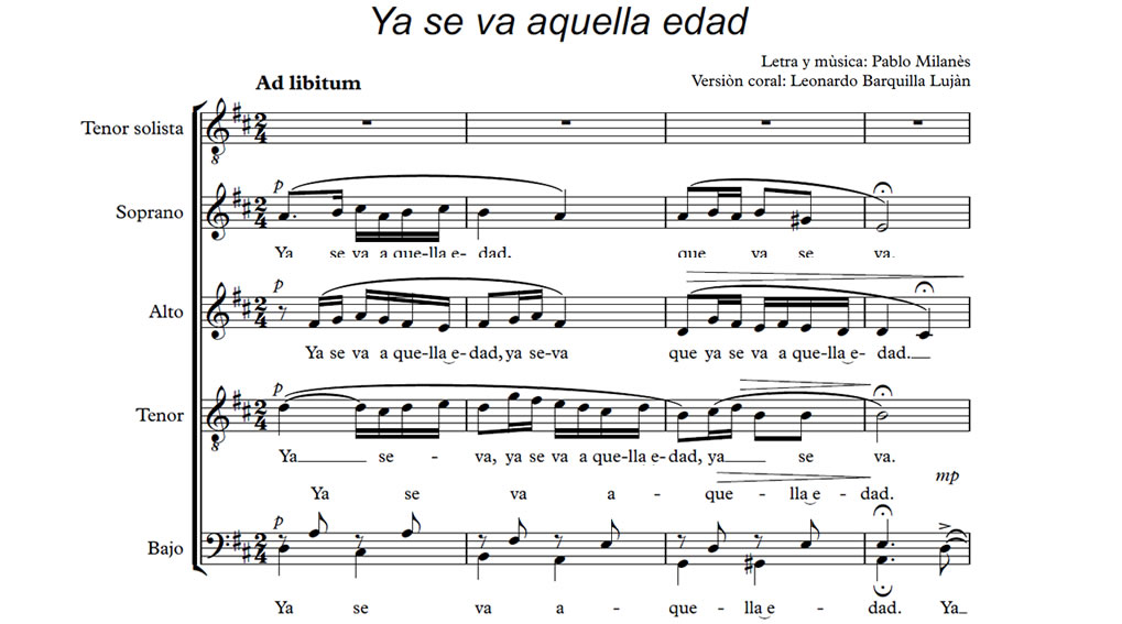 Ya se va aquella edad Anterior Siguiente Favorito Categorías de Archivo: Partituras SATBEtiquetas de Archivo: SATB DescripciónArchivoRetribuir al ArregladorLetra y Música: Pablo Milanés Arreglo Coral: Leonardo Barquilla Luján SATB + Tenor solista. -----------------EmailWhatsAppFacebook 122 Ya_se_va_aquella_edad_SATB.pdf"¿Te gusta y te es útil mi arreglo? Cualquier aporte que puedas hacer seguirá alentando mi labor como arreglador. Muchas Gracias!"