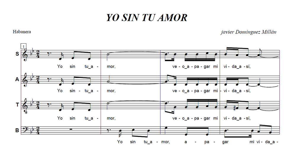Yo sin tu amor Anterior Siguiente Favorito Categorías de Archivo: Partituras SATBEtiquetas de Archivo: SATB DescripciónArchivoMidiHabanera Letra y Música: javier Domínguez Millán -----------------EmailWhatsAppFacebook 87 Yo_sin_tu_amor_SATB.pdf Yo_sin_tu_amor_SATB.mid