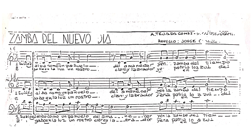 Zamba del nuevo día Anterior Siguiente Favorito Categorías de Archivo: Partituras SABEtiquetas de Archivo: SAB DescripciónArchivoRetribuir al ArregladorLetra: Armando Tejada Gómez Música: Oscar Cardozo Arreglo Coral: Jorge B. Chanal -----------------EmailWhatsAppFacebook 322 zamba-del-nuevo-dia.pdf"¿Te gusta y te es útil este arreglo? Cualquier aporte que puedas hacer en reconocimiento a la labor del Mtro. Jorge Chanal irá destinado a su Familia. Muchas Gracias!"