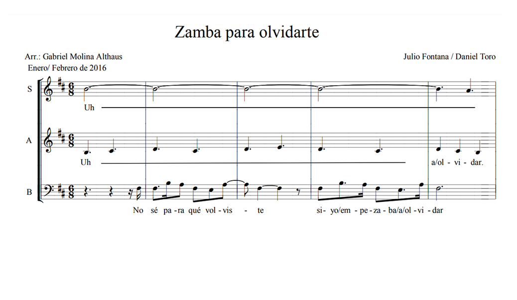 Zamba para olvidarte Anterior Siguiente Favorito Categorías de Archivo: Partituras SABEtiquetas de Archivo: SAB DescripciónArchivoVideo ReferenciaRetribuir al ArregladorZamba de Julio Fontana y Daniel Toro Arreglo Coral: Gabriel Molina Althaus -----------------EmailWhatsAppFacebook 987 Zamba-para-olvidarte-SAB.pdfVideo Referencia"¿Te gusta y te es útil mi arreglo? Cualquier aporte que puedas hacer seguirá alentando mi labor como arreglador. Muchas Gracias!"