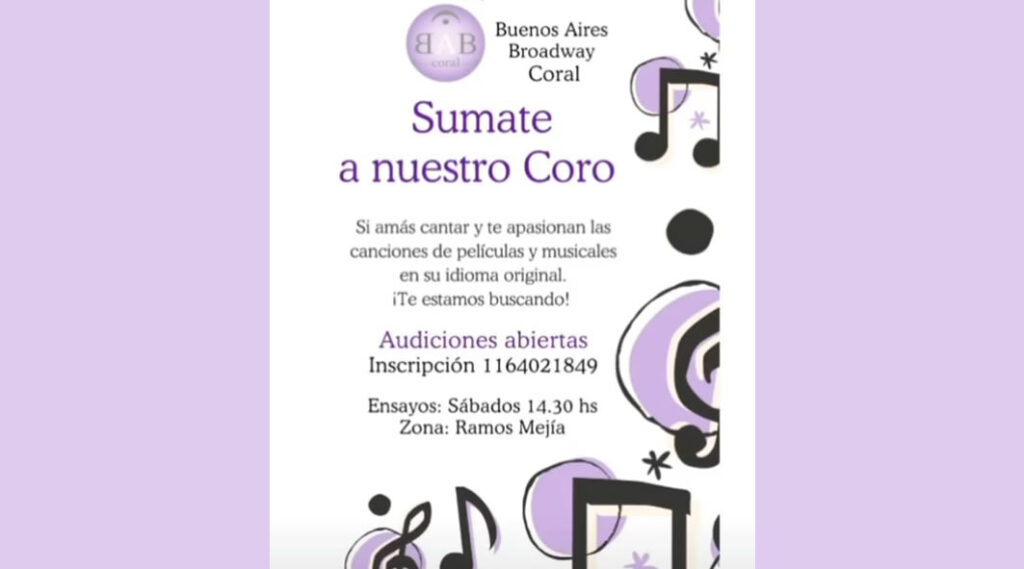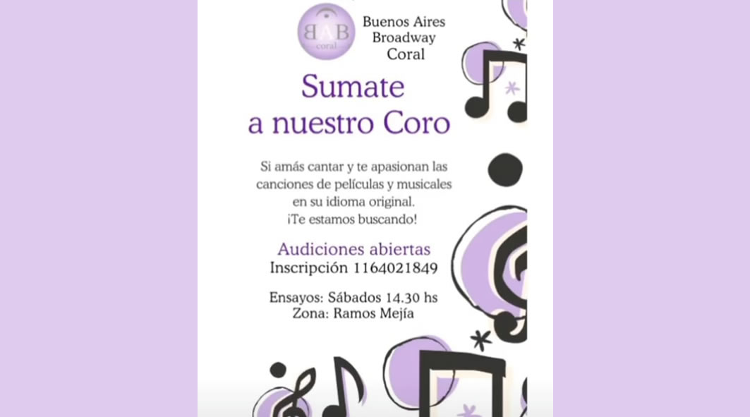 Buenos Aires Broadway Coral AUDICIONES Anterior Siguiente Categorías de Aviso: Coro Busca CantanteEtiquetas de Aviso: Buenos Aires DetallesTel./Cel.ZonaFlyer/imagen*Buenos Aires Broadway Coral AUDICIONES ABIERTAS Sumate a nuestro coro! Canciones de películas y musicales en su idioma original. Ensayos: Sábados 14.30 hs. Zona: Ramos Mejía, Bs. As. Para Audicionar: CLIC AQUÍ +INFO: 11 6402 1849 -----------------EmailWhatsAppFacebook 20 11 6402 1849Ramos Mejía, Bs. As.