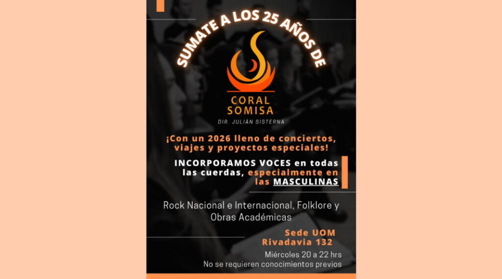 2026 serán los 25 años de Coral SOMISA y preparamos un año lleno de momentos musicales inolvidables: viajes, conciertos, eventos especiales y mucho más. Recorreremos repertorio académico, rock nacional e internacional y folklórico.