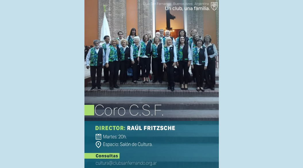 Coro Club San Fernando CONVOCATORIA Anterior Siguiente Categorías de Aviso: Coro Busca CantanteEtiquetas de Aviso: Buenos Aires DetallesMailZonaFlyer/imagen*Coro Club San Fernando Dir. Raúl Fritzsche CONVOCATORIA 2026 Ensayos: Martes, 20 hs. Lugar: Salón de Cultura Club San Fernando +INFO: cultura@clubsanfernando.org.ar -----------------EmailWhatsAppFacebook 7 cultura@clubsanfernando.org.arSan Fernando, Bs. As.