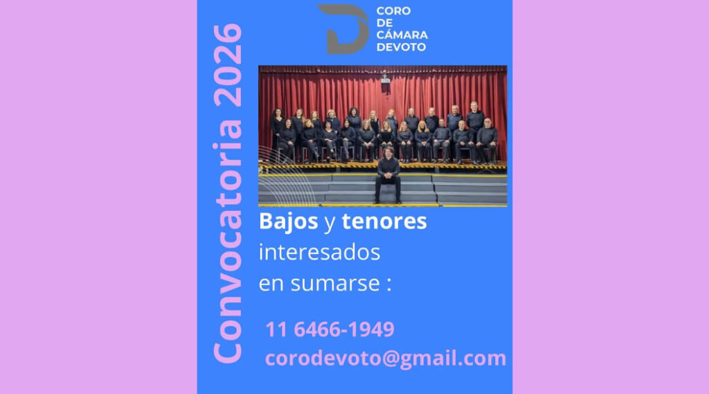 Coro de Cámara Devoto CONVOCATORIA 2026 Anterior Siguiente Categorías de Aviso: Coro Busca CantanteEtiquetas de Aviso: Buenos Aires DetallesMailTel./Cel.ZonaFlyer/imagen*Coro de Cámara Devoto Dir. Joaquín Ayan CONVOCATORIA 2026 Bajos y Tenores +INFO: 11 64466 1949 corodevoto@gmail.com -----------------EmailWhatsAppFacebook 85 corodevoto@gmail.com11 64466 1949Ciudad de Bs. As.