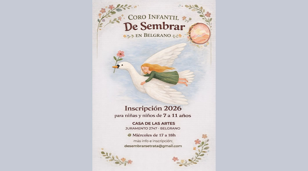 Coro Infantil "De Sembrar" en Belgrano Anterior Siguiente Categorías de Aviso: Coro Busca CantanteEtiquetas de Aviso: Buenos Aires DetallesMailZonaFlyer/imagen*Coro Infantil «De Sembrar» INSCRIPCIÓN 2026 para Niñas y Niños de 7 a 11 años. Lugar: Casa de las Artes Juramento 2747, Belgrano, CABA Ensayos: Miércoles de 17 a 18 hs. +INFO e Inscripción: desembrarsetrata@gmail.com -----------------EmailWhatsAppFacebook 24 desembrarsetrata@gmail.comBelgrano, CABA