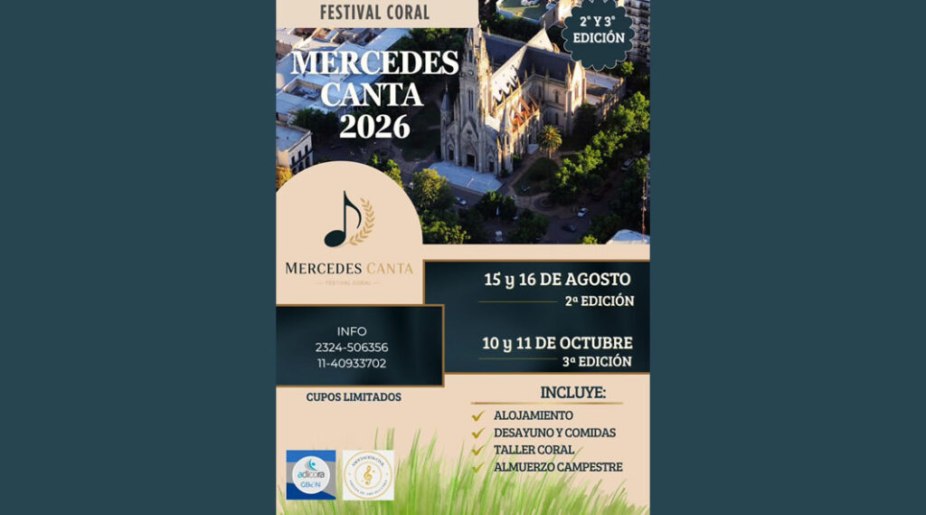 Festival Coral MERCEDES CANTA 2026 invita Anterior Siguiente Categorías de Aviso: Encuentro Busca CoroEtiquetas de Aviso: Buenos Aires DetallesTel./Cel.ZonaFlyer/imagenFestival Coral MERCEDES CANTA 2026 2° y 3° Edición – 15 y 16 de Agosto (2° Edición) – 10 y 11 de Octubre (3° Edición) Incluye: – Alojamiento – Desayuno y comidas – Taller Coral – Almuerzo campestre Cupos limitados +INFO: 2324 506356 / 11 4093 3702 -----------------EmailWhatsAppFacebook 74 2324 506356 / 11 4093 3702Mercedes, Bs. As.