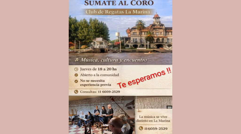SUMATE al Coro Club Regatas La Marina Anterior Siguiente Categorías de Aviso: Coro Busca CantanteEtiquetas de Aviso: Buenos Aires DetallesTel./Cel.ZonaFlyer/imagen*Coro Club Regatas La Marina Dir. María Isabel Núñez SUMATE!!! Música, Cultura y Encuentro. Abierto a la Comunidad. Ensayos: Jueves de 18 a 20 hs. Zona: Tigre, Bs. As. No se necesita experiencia previa. +INFO: 11 6059 2529 -----------------EmailWhatsAppFacebook 21 11 6059 2529Tigre, Bs. As.