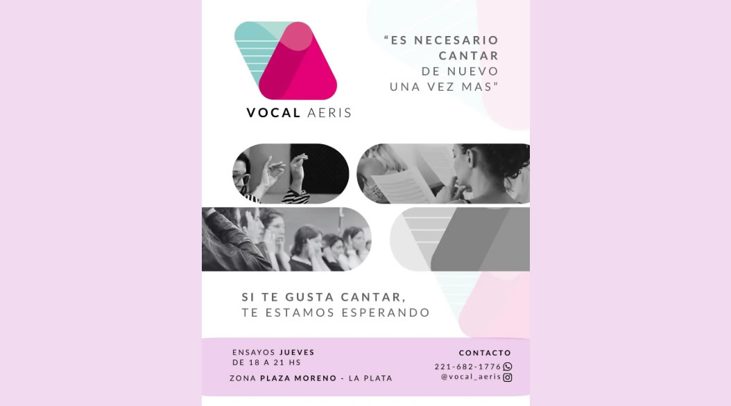 Vocal Aeris CONVOCA Anterior Siguiente Categorías de Aviso: Coro Busca CantanteEtiquetas de Aviso: Buenos Aires DetallesTel./Cel.ZonaFlyer/imagen*Vocal Aeris Dir. Noelia Di Santo Si te gusta cantar, ¡TE ESTAMOS ESPERANDO! Ensayos: Jueves de 18 a 21 hs. Zona: Plaza Moreno, La Plata, Bs. As. +INFO: 221 682 1776 (ws) @vocal_aeris (ig) -----------------EmailWhatsAppFacebook 15 221 682 1776La Plata, Bs. As.
