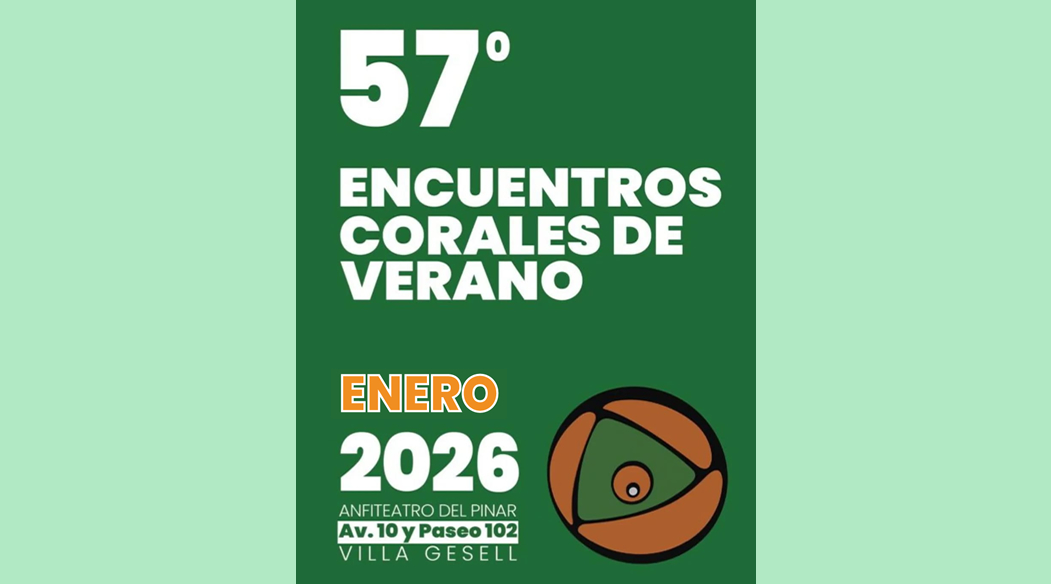 57° Encuentros Corales de Verano 2026 | Anfiteatro del Pinar, VILLA GESELL, Bs. As. Anterior Siguiente Categorías de Evento: Encuentro Coral InfoGalería de Imágenes57° Encuentros Corales de Verano 2026 Participan: *Orfeón Cenit Mendoza, Mendoza. *Passeri Mendoza, Mendoza. *Aware Córdoba, Córdoba. Sábado 24 de Enero, 21:00 hs. Anfiteatro del Pinar Avenida 10 y Paseo 102, VILLA GESELL, Bs. As. Entrada: Libre y gratuita -----------------EmailWhatsAppFacebook 17