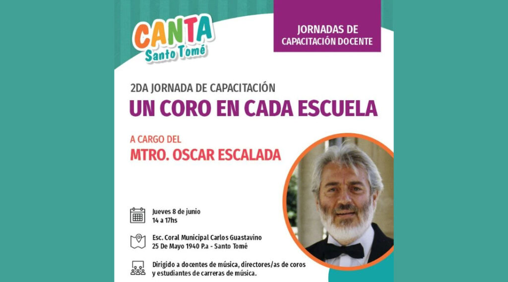 En el marco de la 3ra edición “CANTA SANTO TOME” 2023 y con el objetivo de contribuir a la generación de nuevos espacios para el desarrollo del canto coral en los niños, la Escuela Coral Municipal Carlos Guastavino invita a la 2da Jornada de capacitación “Un coro en cada escuela” a cargo del Mtro. Oscar Escalada destinada a docentes de música, directores/as de coros y estudiantes de carreras de música.