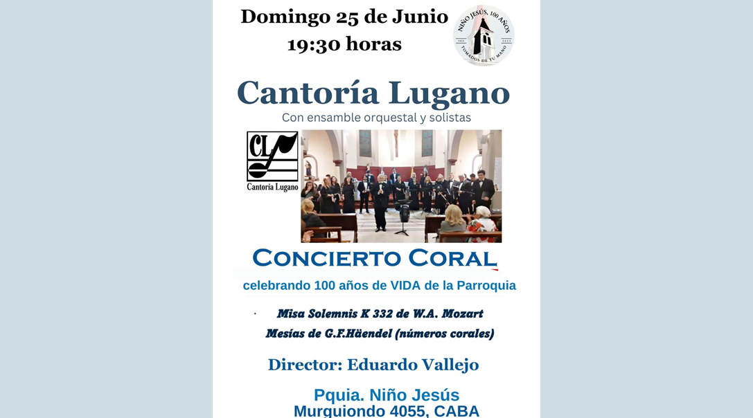 CANTORÍA LUGANO | Pquia. Niño Jesús, CABA Anterior Siguiente Categorías de Evento: Concierto InfoGalería de Imágenes*CANTORÍA LUGANO Dir. Eduardo Vallejo Con Ensamble Orquestal y Solistas. Misa Solemnis K332 de W,A, Mozart Mesías de G.F. Häendel (Números Corales) Domingo 25 de Junio, 19.30 hs. Parroquia Niño Jesús, Murguiondo 4055, CABA Entrada libre y gratuita. -----------------EmailWhatsAppFacebook 26