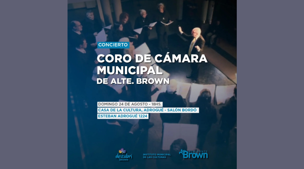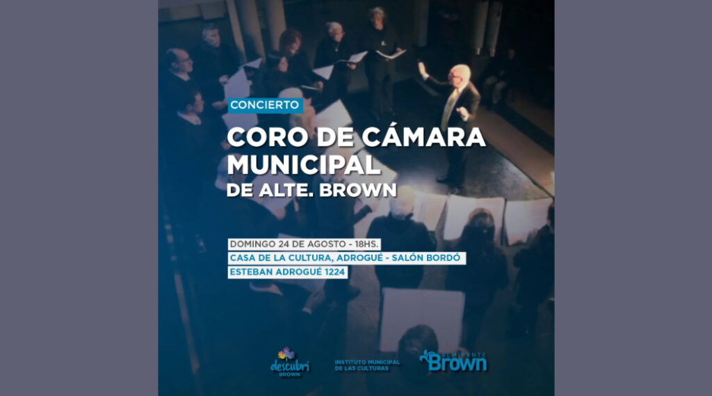 CONCIERTO "Coro de Cámara Municipal de Alte. Brown" | Casa de la Cultura, ADROGUÉ, Bs. As. Anterior Siguiente Categorías de Evento: Concierto InfoGalería de ImágenesCONCIERTO *Coro de Cámara Municipal de Alte. Brown Dir. Carlos Cunioli Domingo 24 de agosto, 18 hs. Casa de la Cultura Salón Bordó, Esteban Adrogué 1224, ADROGUÉ, Bs. As. -----------------EmailWhatsAppFacebook 23