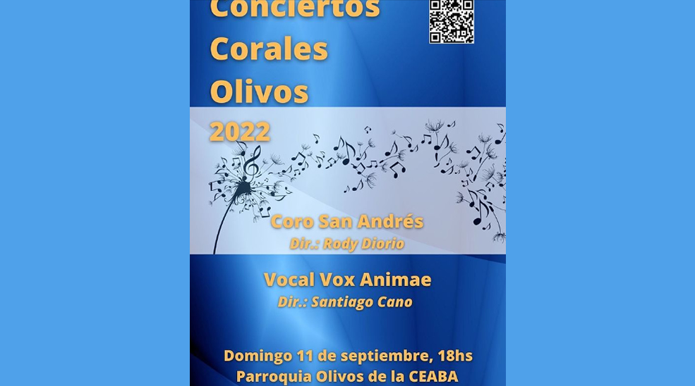 Conciertos Corales Olivos 2022 | Parroquia Olivos, CEABA, Florida, Bs. As. Anterior Siguiente Categorías de Evento: Concierto InfoGalería de ImágenesConciertos Corales Olivos 2022 Participan: *Coro San Andrés Dir. Rodolfo Diorio *Vocal Vox Animae Dir. Santiago Cano Domingo 11 de Septiembre, 18 hs. Parroquia Olivos, CEABA Nicolás Avellaneda 1537, Florida, Bs. As. -----------------EmailWhatsAppFacebook 30