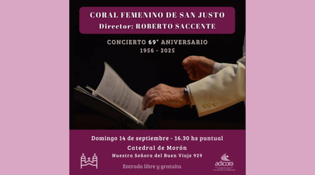 CORAL FEMENINO DE SAN JUSTO "Concierto 69° Aniversario" | Catedral de Morón, MORÓN, Bs. As. Anterior Siguiente Categorías de Evento: Concierto InfoGalería de ImágenesConcierto 69° Aniversario *CORAL FEMENINO DE SAN JUSTO Dir. Roberto Saccente Domingo 14 de Septiembre, 16.30 hs. Catedral de Morón Ntra. Sra. del Buen Viaje 929, MORÓN, Bs. As. Entrada libre y gratuita. -----------------EmailWhatsAppFacebook 60