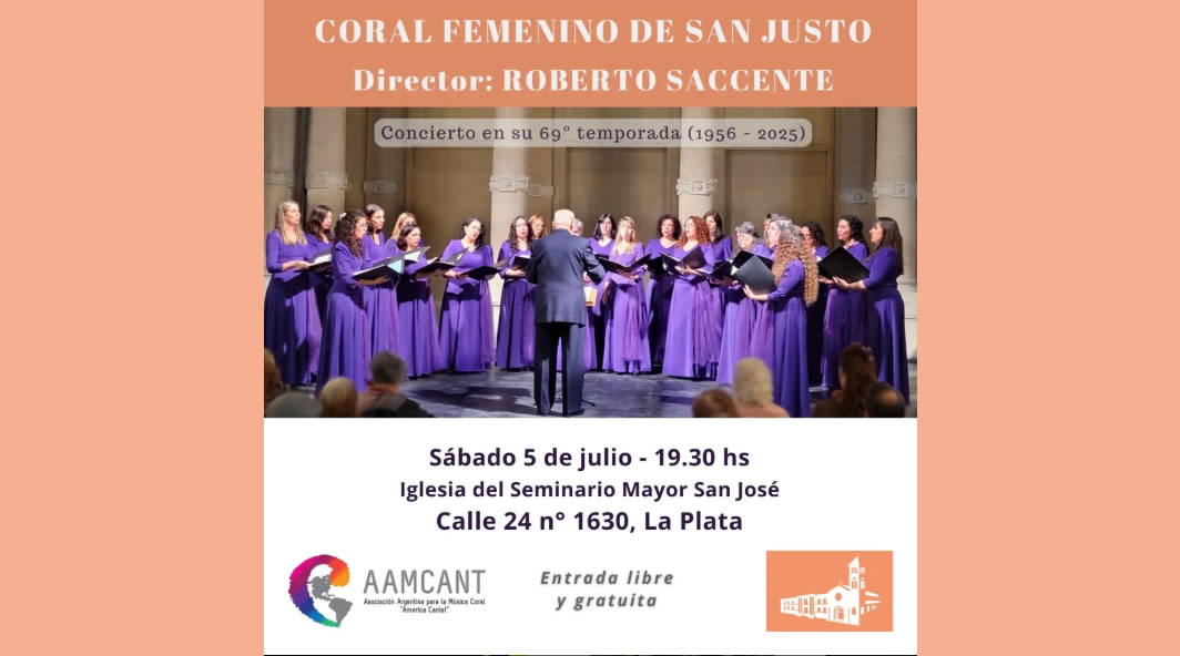 CORAL FEMENINO DE SAN JUSTO | Iglesia del Seminario Mayor San José, LA PLATA, Bs. As. Anterior Siguiente Categorías de Evento: Concierto InfoGalería de ImágenesConcierto en su 69 temporada (1956-2025) *CORAL FEMENINO DE SAN JUSTO Dir. Roberto Saccente Sábado 5 de Julio, 19.30 hs. Iglesia del Seminario Mayor San José, Calle 24 nro. 1630, LA PLATA, Bs. As. Entrada libre y gratuita. -----------------EmailWhatsAppFacebook 33