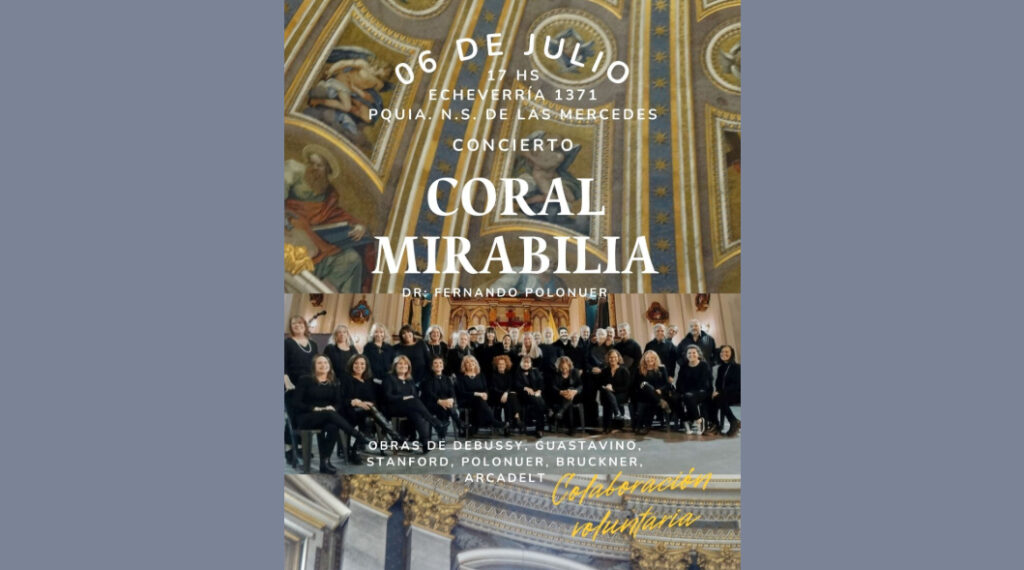 CORAL MIRABILIA | Parroquia Nuestra Señora de las Mercedes, CABA Anterior Siguiente Categorías de Evento: Concierto InfoGalería de Imágenes*CORAL MIRABILIA Dir. Fernando Polonuer Obras de: Debussy, Guastavino, Stanford, Polonuer, Bruckner, Arcadelt. Domingo 6 de Julio, 17 hs. Parroquia Nuestra Señora de las Mercedes, Echeverría 1371, CABA Entrada: Colaboración voluntaria. -----------------EmailWhatsAppFacebook 42