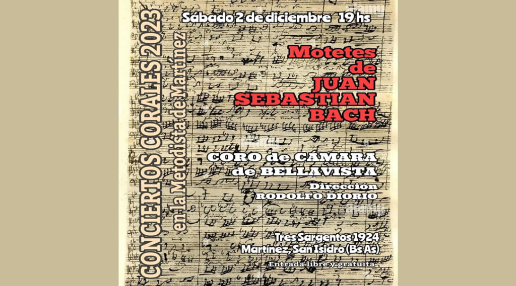 Coro de Cámara Bella Vista | Iglesia Evangélica Metodista de Martínez, MARTÍNEZ, Bs. As. Anterior Siguiente Categorías de Evento: Concierto InfoGalería de ImágenesMotetes de Johann Sebastian Bach *Coro de Cámara Bella Vista Dir. Rodolfo Diorio Sábado 2 de Diciembre, 19 hs. Iglesia Evangélica Metodista de Martínez Tres Sargentos 1924, MARTÍNEZ, Bs. As. Entrada libre y gratuita. -----------------EmailWhatsAppFacebook 75