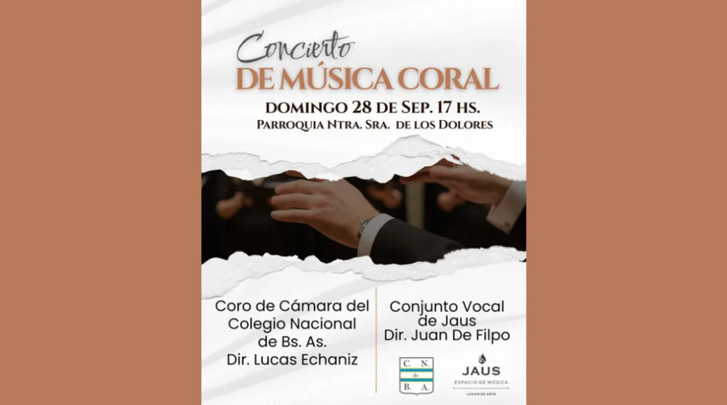 Coro de Cámara del CNBA & Conjunto Vocal de Jaus | Pquia. Ntra. Señora de los Dolores, TRENQUE LAUQUEN, Bs. As. Anterior Siguiente Categorías de Evento: Concierto InfoGalería de ImágenesCONCIERTO de MÚSICA CORAL Participan: *Coro de Cámara del Colegio Nacional Buenos Aires Dir. Lucas Echaniz *Conjunto Vocal de Jaus Dir. Juan De Filpo Domingo 28 de Septiembre, 17 hs Pquia. Ntra. Señora de los Dolores Oro 58, TRENQUE LAUQUEN, Bs. As. -----------------EmailWhatsAppFacebook 21