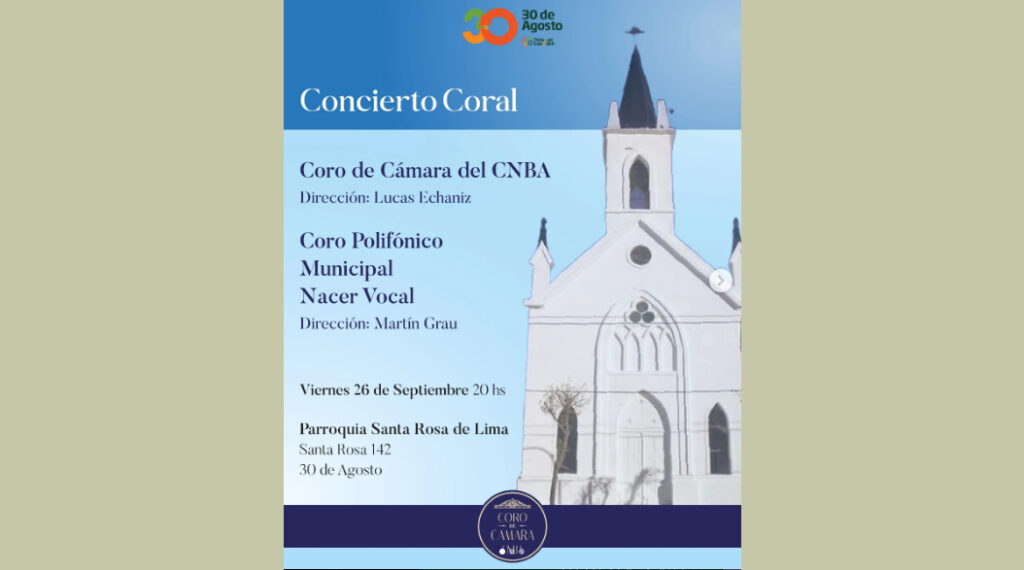 Inicio » Eventos Corales » Argentina » Provincia de Buenos Aires » 30 de Agosto » Concierto » Coro de Cámara del CNBA & Coro Polifónico Municipal Nacer Vocal | Pquia. Santa Rosa de Lima, 30 DE AGOSTO, Trenque Lauquen, Bs. As.