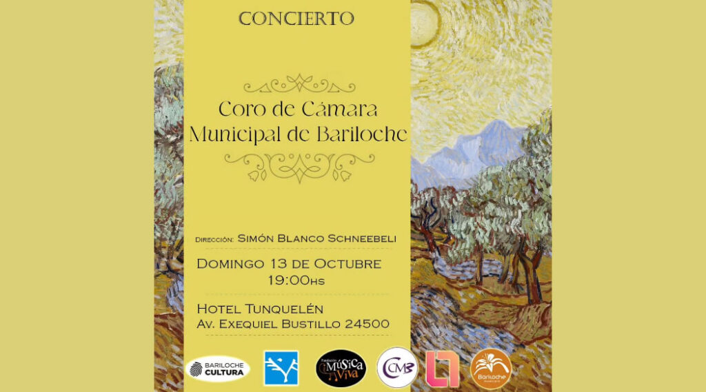 Coro de Cámara Municipal de Bariloche | Hotel Tunquelén, SAN CARLOS DE BARILOCHE, Río Negro Anterior Siguiente Categorías de Evento: Concierto InfoGalería de ImágenesCONCIERTO *Coro de Cámara Municipal de Bariloche Dir. Simón Blanco Schneebeli Domingo 13 de Octubre, 19 hs. Hotel Tunquelén, Av. Exequiel Bustillo 24500, SAN CARLOS DE BARILOCHE, Río Negro -----------------EmailWhatsAppFacebook 25