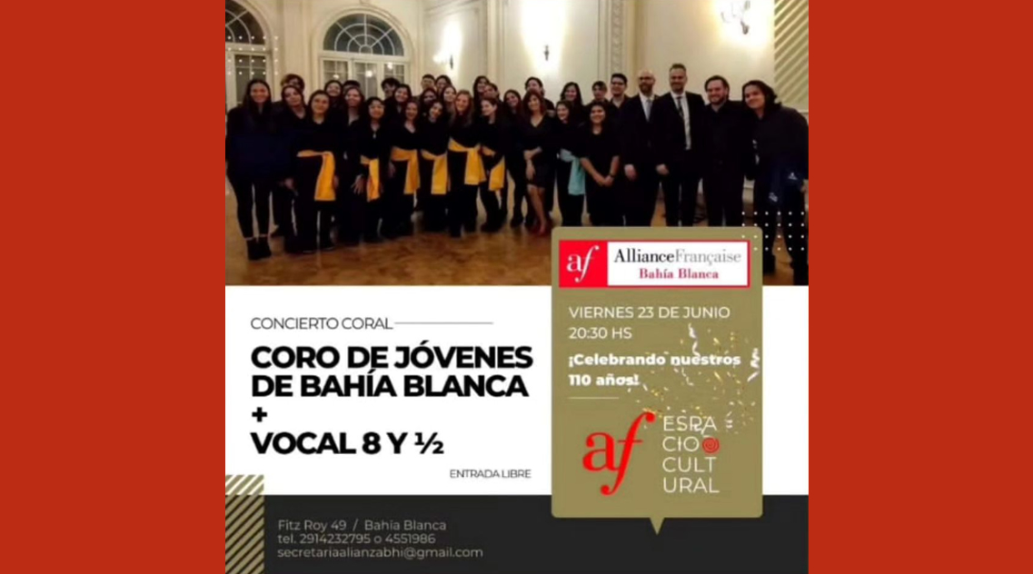 Coro de Jóvenes de Bahía Blanca & Vocal 8 y 1/2 | Alianza Francesa, BAHÍA BLANCA, Bs. As. Anterior Siguiente Categorías de Evento: Concierto InfoGalería de ImágenesCONCIERTO CORAL *Coro de Jóvenes de Bahía Blanca *Vocal 8 y 1/2 Viernes 23 de Junio, 20.30 hs. Alianza Francesa, Fitz Roy 49, BAHÍA BLANCA, Bs. As. Entrada libre. -----------------EmailWhatsAppFacebook 42