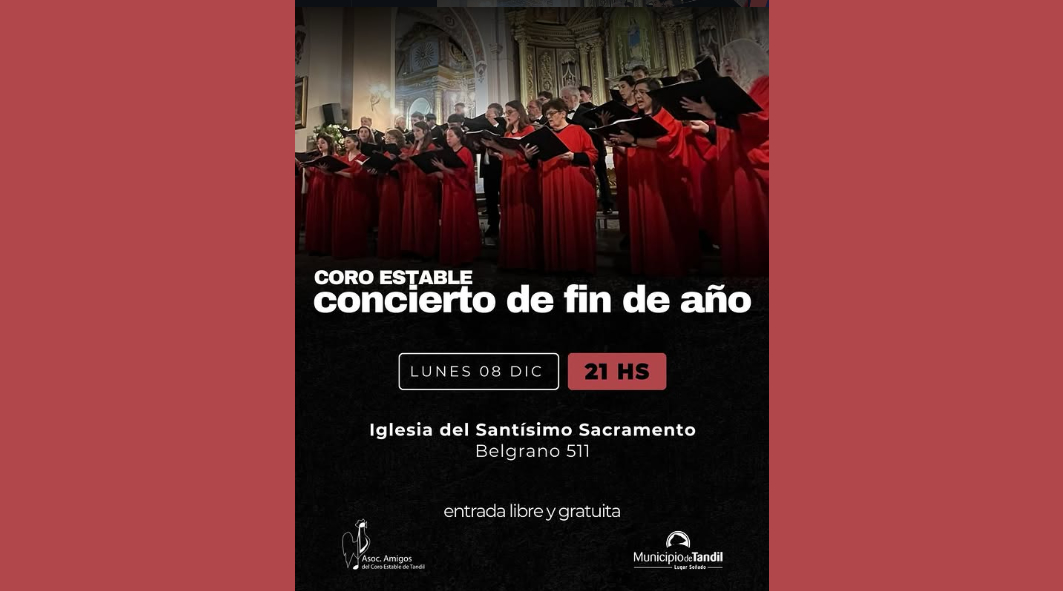 Coro Estable de Tandil "CONCIERTO DE FIN DE AÑO" | Iglesia del Santísimo Sacramento, TANDIL, Bs. As. Anterior Siguiente Categorías de Evento: Concierto InfoGalería de Imágenes«CONCIERTO DE FIN DE AÑO» *Coro Estable de Tandil Dir. Annele Moroder Lunes 8 de Diciembre, 21 hs. Iglesia del Santísimo Sacramento, Belgrano 511, TANDIL, Bs. As. Entrada libre y gratuita. -----------------EmailWhatsAppFacebook 17
