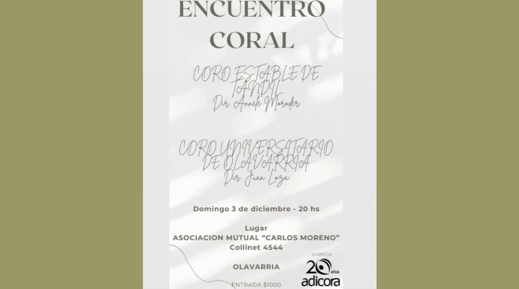 Coro Estable de Tandil & Coro Universitario de Olavarría | Asoc. Mutual "Carlos Moreno", OLAVARRÍA, Bs. As. Anterior Siguiente Categorías de Evento: Encuentro Coral InfoGalería de ImágenesENCUENTRO CORAL *Coro Estable de Tandil Dir. Annele Moroder *Coro Universitario de Olavarría Dir. Juan Loza Domingo 3 de Diciembre, 20 hs. Asociación Mutual «Carlos Moreno» Collinet 4544, OLAVARRÍA, Bs. As. Entrada $ 1000.- -----------------EmailWhatsAppFacebook 23