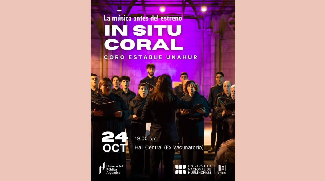 Coro Estable UNAHUR "In Situ Coral" | Universidad Nacional de Hurlingham, Hall Central, VILLA TESEI, Bs. As. Anterior Siguiente Categorías de Evento: Concierto InfoGalería de Imágenes«In Situ Coral» La música antes del estreno. *Coro Estable UNAHUR Dir. Matías Martínez Viernes 24 de Octubre, 19 hs. Universidad Nacional de Hurlingham, Hall Central, Tte. Origone 151, VILLA TESEI, Bs. As. -----------------EmailWhatsAppFacebook 57