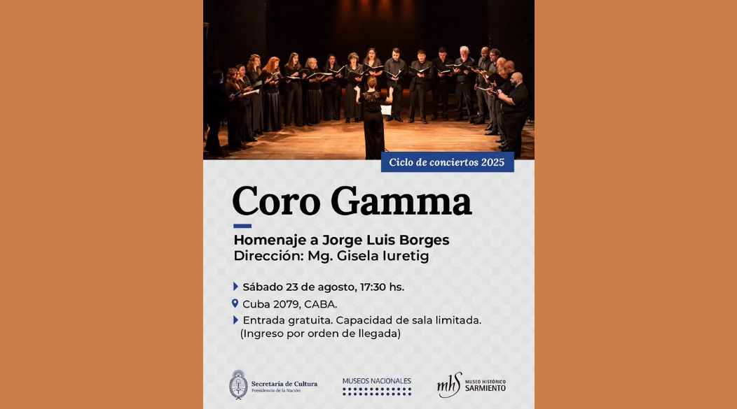 CORO GAMMA "Homenaje a Jorge Luis Borges" | Museo Histórico Sarmiento, CABA Anterior Siguiente Categorías de Evento: Concierto InfoGalería de Imágenes«Homenaje a Jorge Luis Borges» *CORO GAMMA Dir. Gisela Luretig Sábado 23 de Agosto, 17.30 hs. Museo Histórico Sarmiento, Cuba 2079, CABA Entrada gratuita. Capacidad de sala limitada (Ingreso por orden de llegada) -----------------EmailWhatsAppFacebook 34