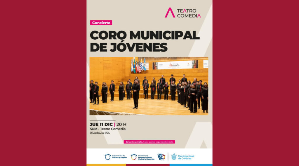 CORO MUNICIPAL DE JÓVENES de Córdoba | SUM Teatro Comedia , CÓRDOBA Anterior Siguiente Categorías de Evento: Concierto InfoGalería de Imágenes*CORO MUNICIPAL DE JÓVENES de Córdoba Dir. Tomás Arinci Jueves 11 de Diciembre, 20 h Teatro Comedia Rivadavia Rivadavia 254, CÓRDOBA Entrada gratuita por boletería del teatro desde las 16 h hasta agotar capacidad. -----------------EmailWhatsAppFacebook 17