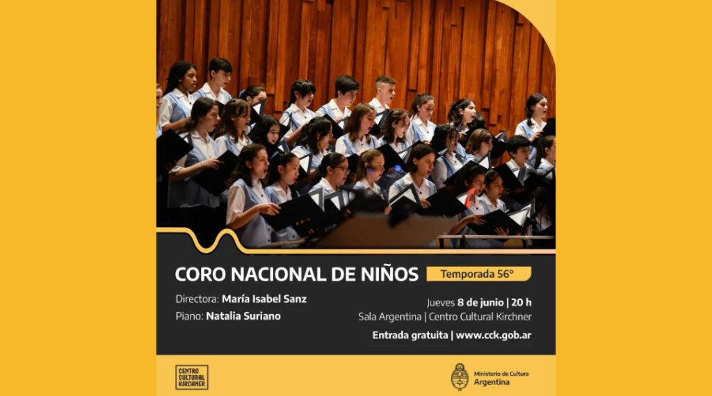 CORO NACIONAL DE NIÑOS | Centro Cultural Kirchner, CABA Anterior Siguiente Categorías de Evento: Concierto InfoGalería de ImágenesTemporada 56° *CORO NACIONAL DE NIÑOS Dir. María Isabel Sanz Piano: Natalia Suriano Jueves 8 de Junio, 20 hs. Centro Cultural Kirchner Sala Argentina, Sarmiento 151, CABA Entrada gratuita www.cck.gob.ar -----------------EmailWhatsAppFacebook 15