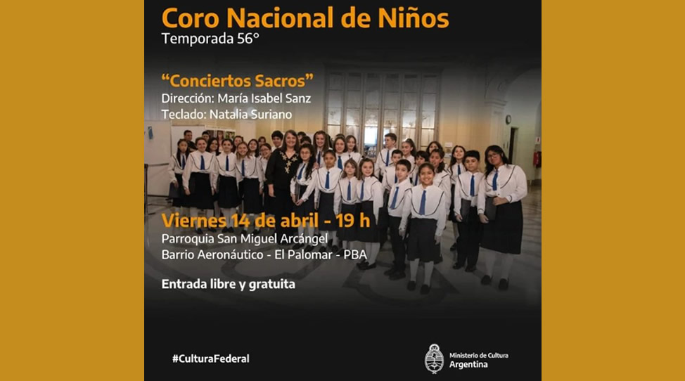 Coro Nacional de Niños "Conciertos Sacros" | Pquia. San Miguel Arcángel, Barrio Aeronáutico, EL PALOMAR, Bs. As. Anterior Siguiente Categorías de Evento: Concierto InfoGalería de Imágenes«Conciertos Sacros» *Coro Nacional de Niños Dir. María Isabel Sanz Teclado: Natalia Suriano Viernes 14 de abril, 19 hs. Pquia. San Miguel Arcángel, Barrio Aeronáutico, PALOMAR, Bs. As. Entrada libre y Gratuita. -----------------EmailWhatsAppFacebook 19