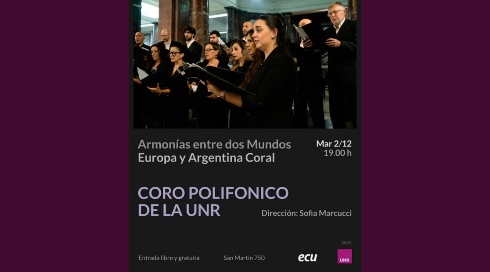 CORO POLIFÓNICO de la UNR "Armonías entre dos mundos" | Espacio Cultural Universitario, ROSARIO, Santa Fe Anterior Siguiente Categorías de Evento: Concierto InfoGalería de Imágenes«Armonías entre dos mundos» Europa y Argentina Coral *CORO POLIFÓNICO de la UNR Dir. Sofía Marcucci Martes 2 de Diciembre, 19 hs. Espacio Cultural Universitario San Martín 750, ROSARIO, Santa Fe Entrada libre y gratuita. -----------------EmailWhatsAppFacebook 20