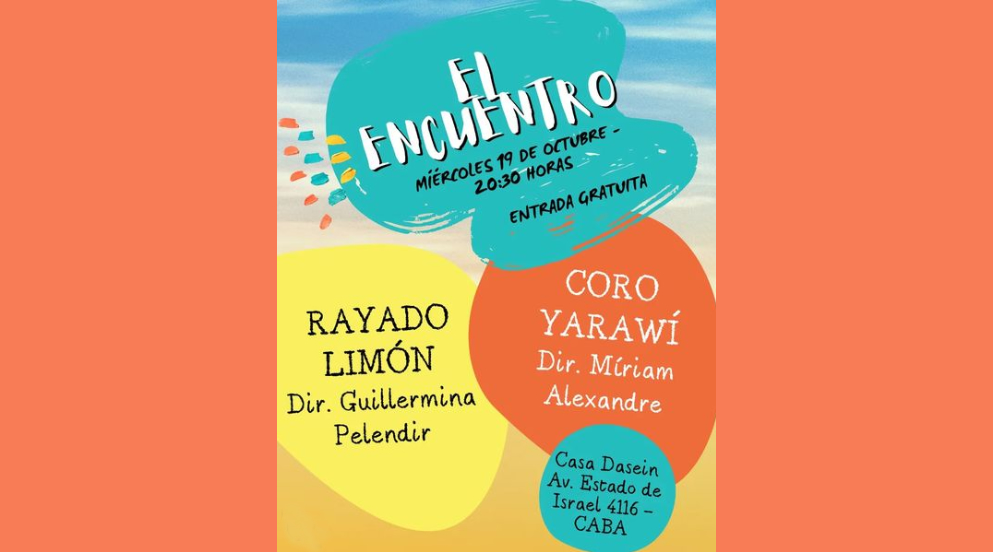 "EL ENCUENTRO" Rayado Limón y Coro Yarawí | Casa Dasein, CABA Anterior Siguiente Categorías de Evento: Encuentro Coral InfoGalería de Imágenes«EL ENCUENTRO» *Rayado Limón Dir. Guillermina Pelendir *Coro Yarawí Dir. Míriam Alexandre Miércoles 19 de Octubre, 20.30 hs. Casa Dasein, Av. Estado de Israel 4116, CABA Entrada libre y gratuita. -----------------EmailWhatsAppFacebook 10