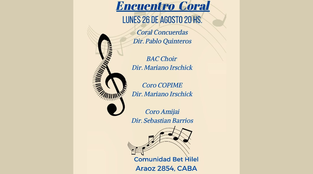 ENCUENTRO CORAL | Comunidad Bet Hilel, CABA Anterior Siguiente Categorías de Evento: Encuentro Coral InfoGalería de ImágenesENCUENTRO CORAL Participan: *Coral Concuerdas Dir. Pablo Quinteros *BAC Choir Dir. Mariano Irschick *Coro COPIME Dir. Mariano Irschick *Coro Amijai Dir. Sebastián Barrios Lunes 26 de Agosto, 20 hs. Comunidad Bet Hilel, Araoz 2854, CABA -----------------EmailWhatsAppFacebook 27